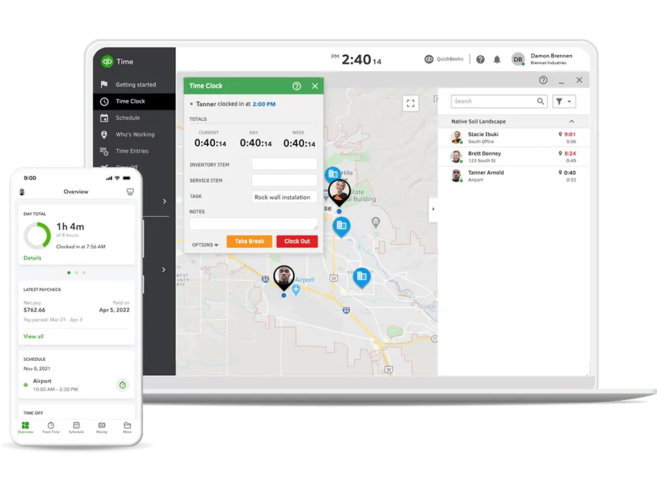 Empower your team with the QuickBooks Workforce app. Employees can track, submit, and approve time from anywhere on their mobile device. Get real-time answers to "who's working?" and see what job they are on.
